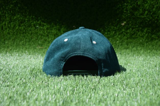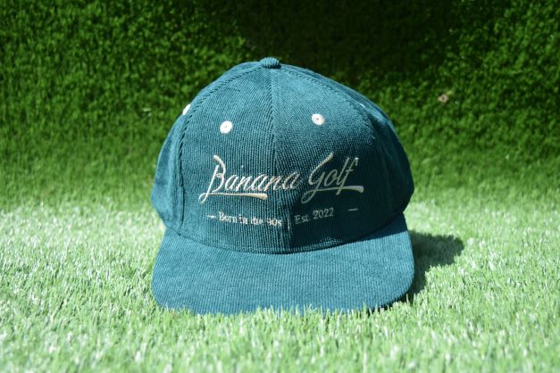 The Banana Golf Corduroy 5 Panel in Forest Green. A five-panel hat constructed from Corduroy with embroidered eyelets and adjustable strap. Finished with embroidered branding in cream.